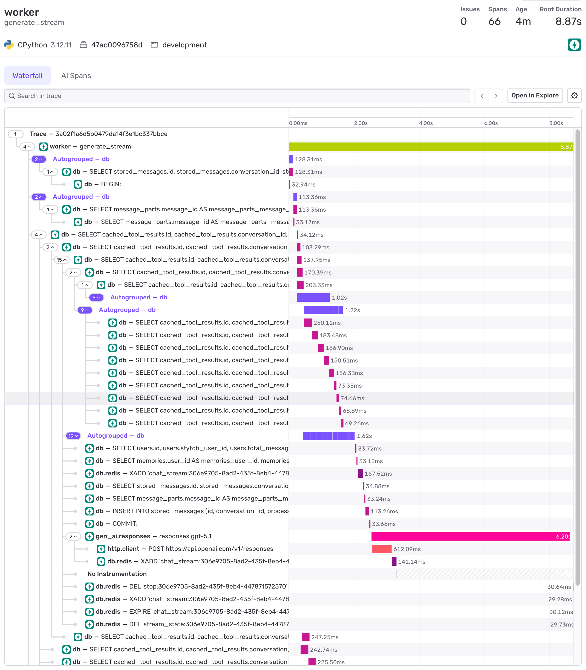 (The problem, if you’re interested, was that Sentry automatically sets up transactions for FastAPI endpoints but not for ones that return StreamingResponses. The solution was to write that in manually.)