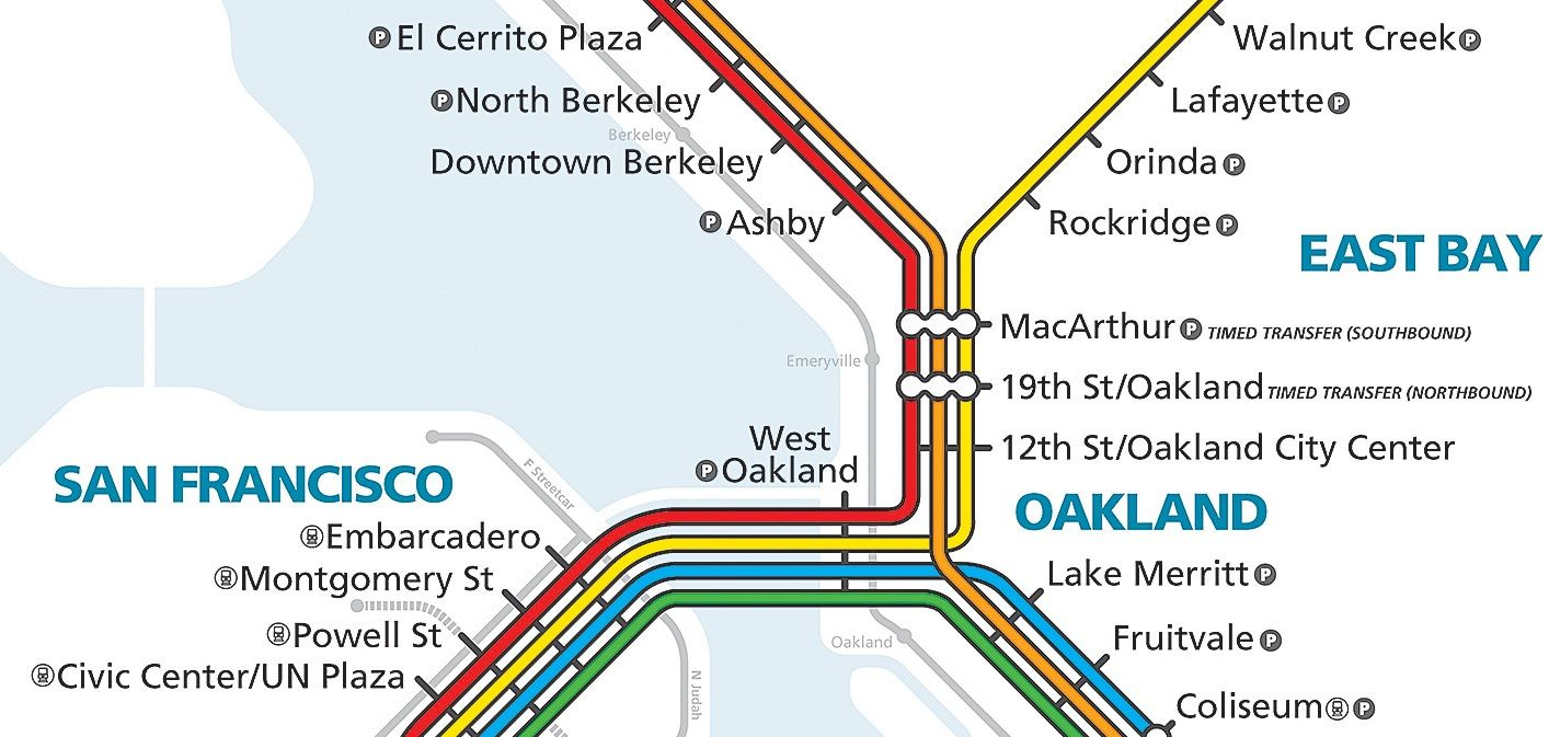 (MacArthur is actually not that far from the entrance to the Transbay tunnel, but trains going into San Francisco have to divert and run through downtown Oakland, adding ten minutes to the overall commute. In fact, in 2001, BART proposed building a bypass from the Transbay tunnel to MacArthur, which would improve throughput and commute times throughout northern East Bay. Combined with a second transbay tunnel, it would effectively double BART’s capacity. Obviously, it was never built.)